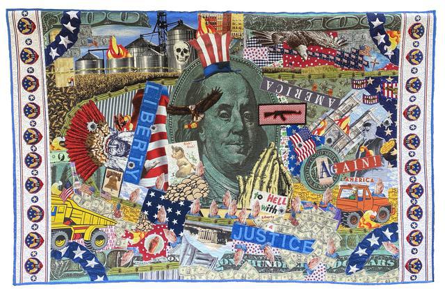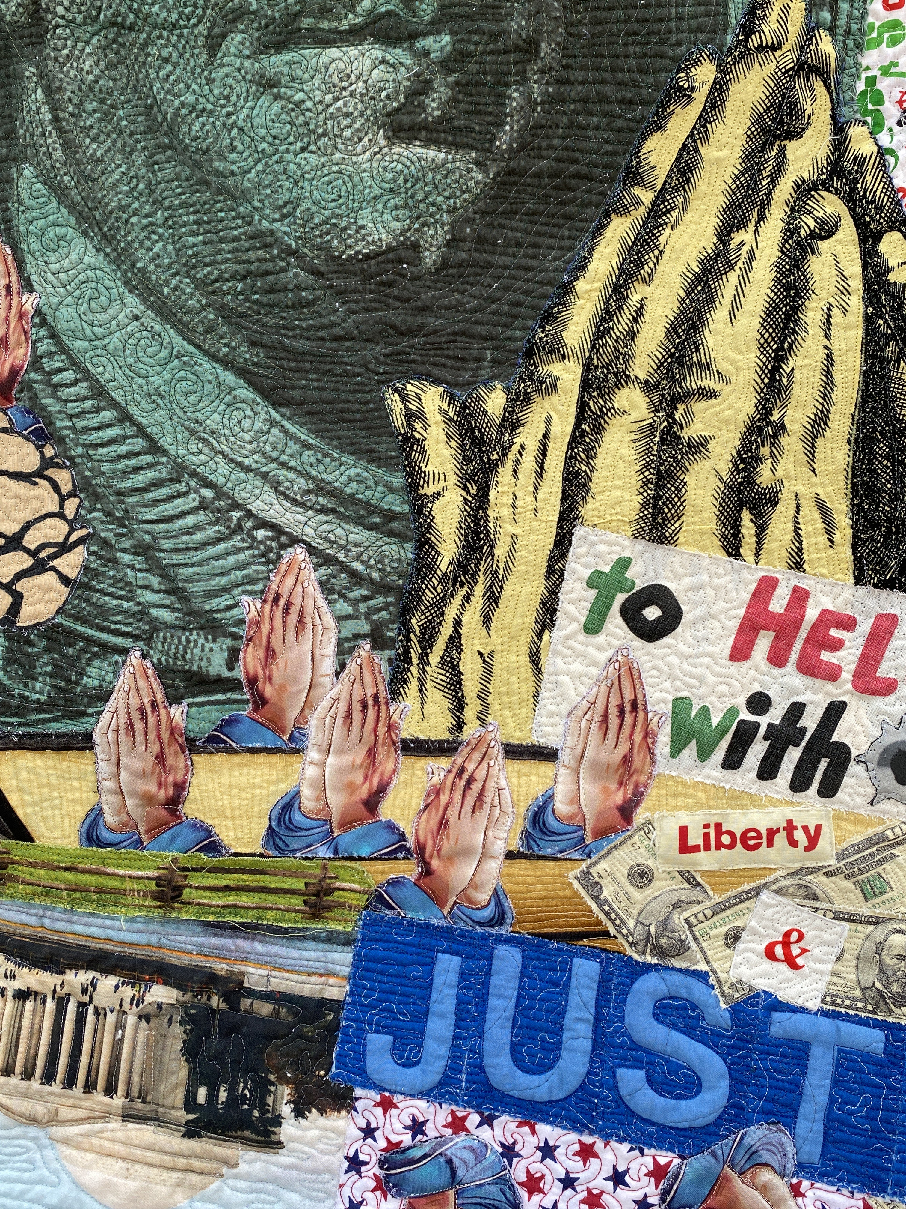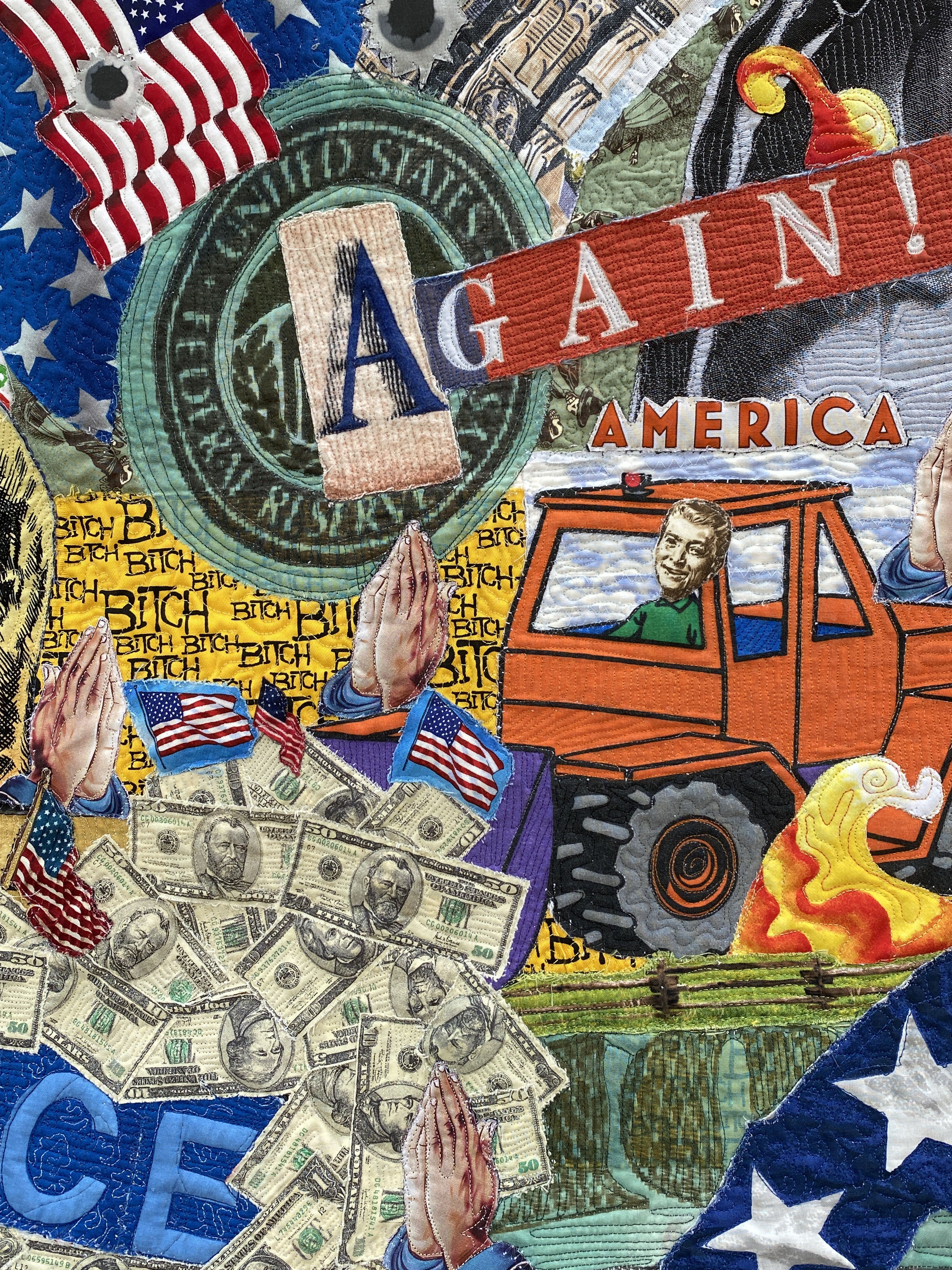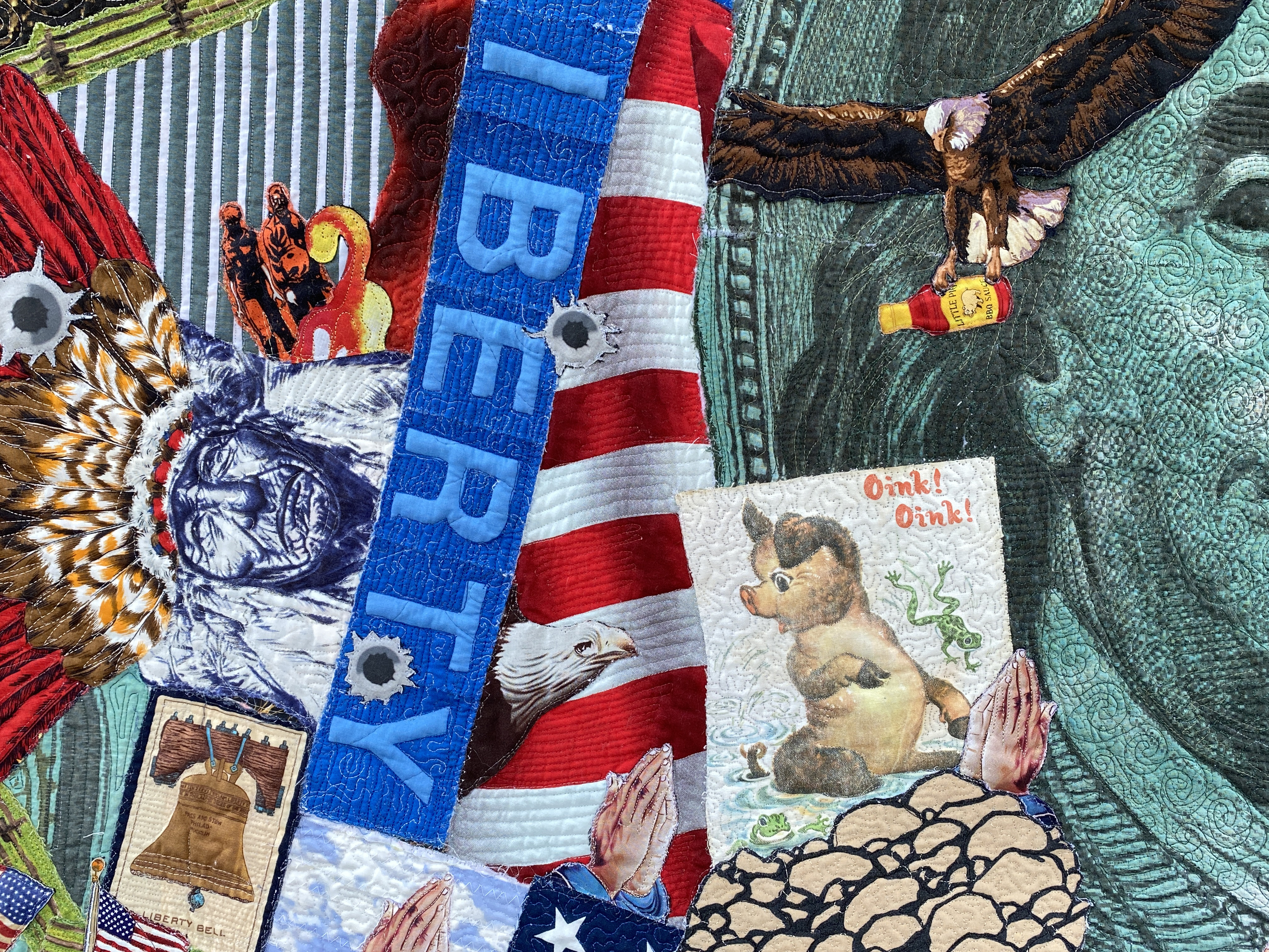 Altered wall hanging, commercial fabrics. Pieced, applique, and machine quilted.