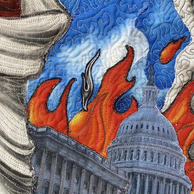 Commercial and found fabrics- pieced, appliqué, and machine quilted.